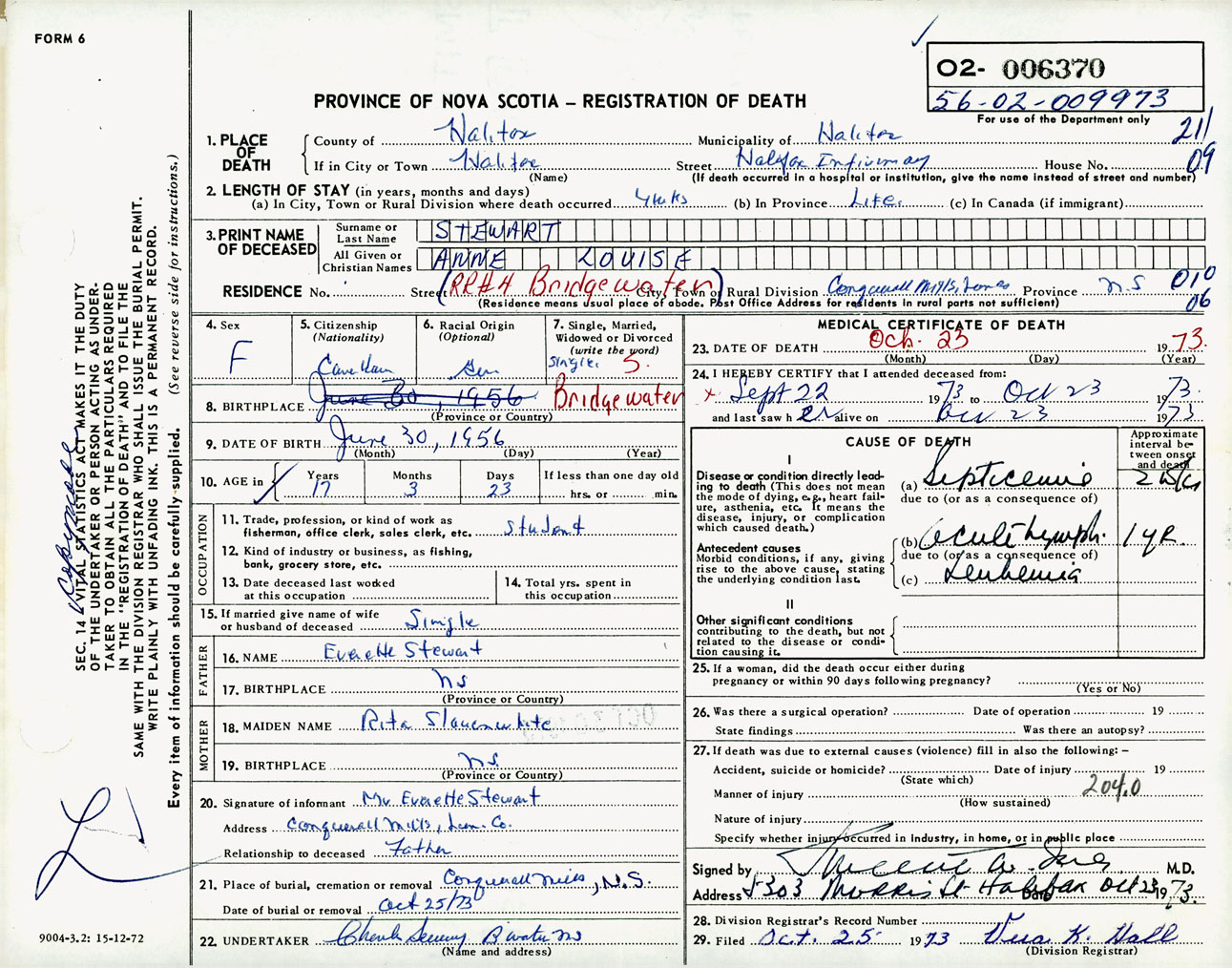Female Death Registration: Year: 1973 number: 6370
