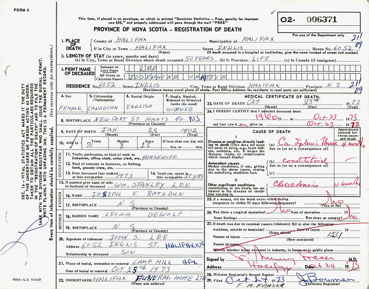 Female Death Registration: Year: 1973 number: 6371