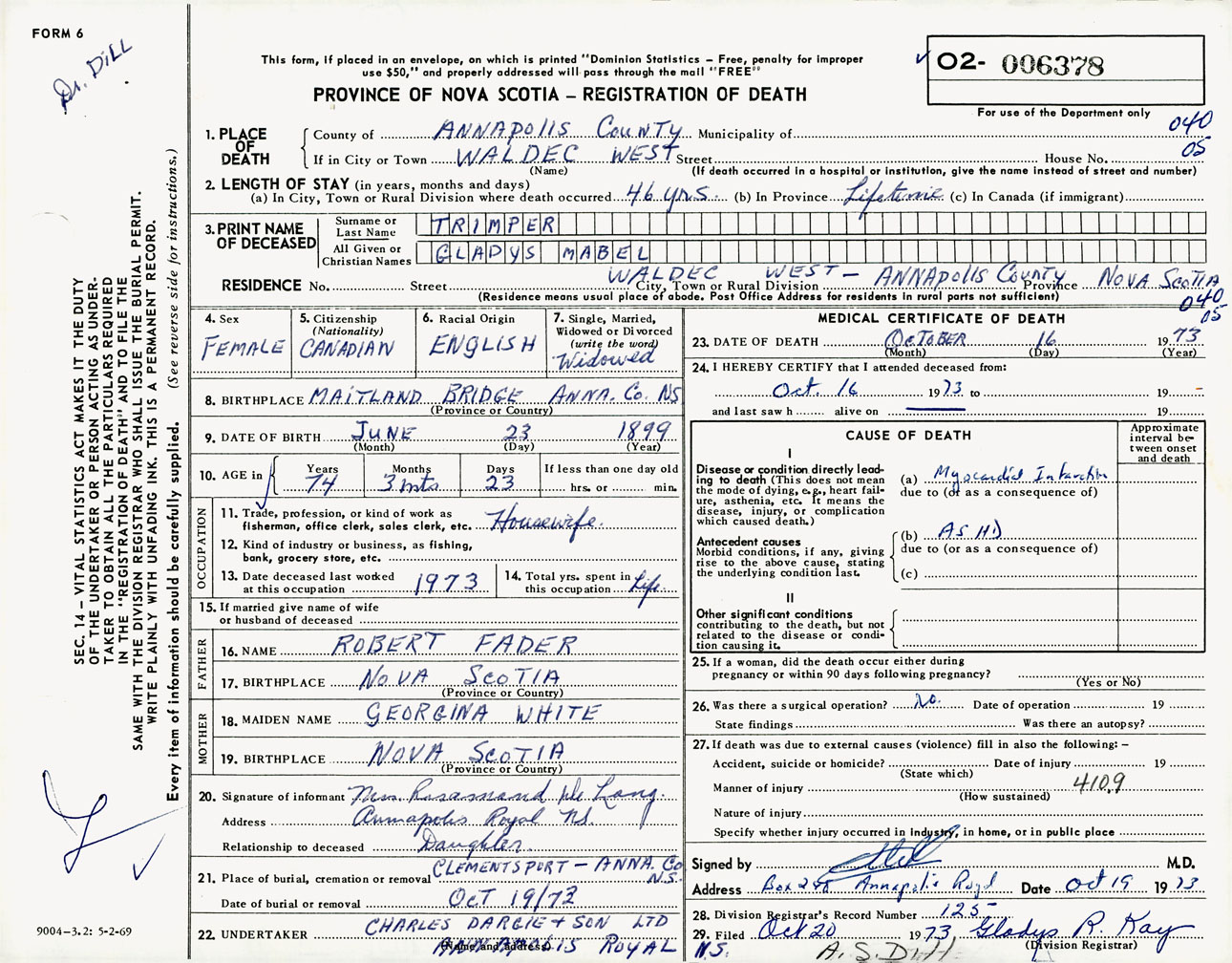 Female Death Registration: Year: 1973 number: 6378