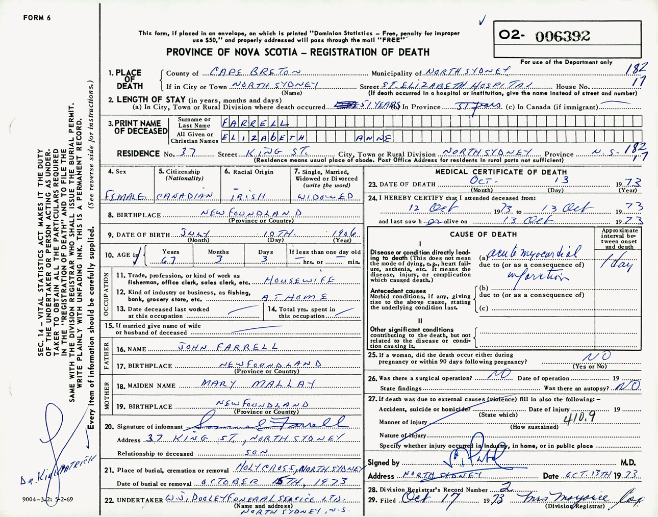 Female Death Registration: Year: 1973 number: 6392