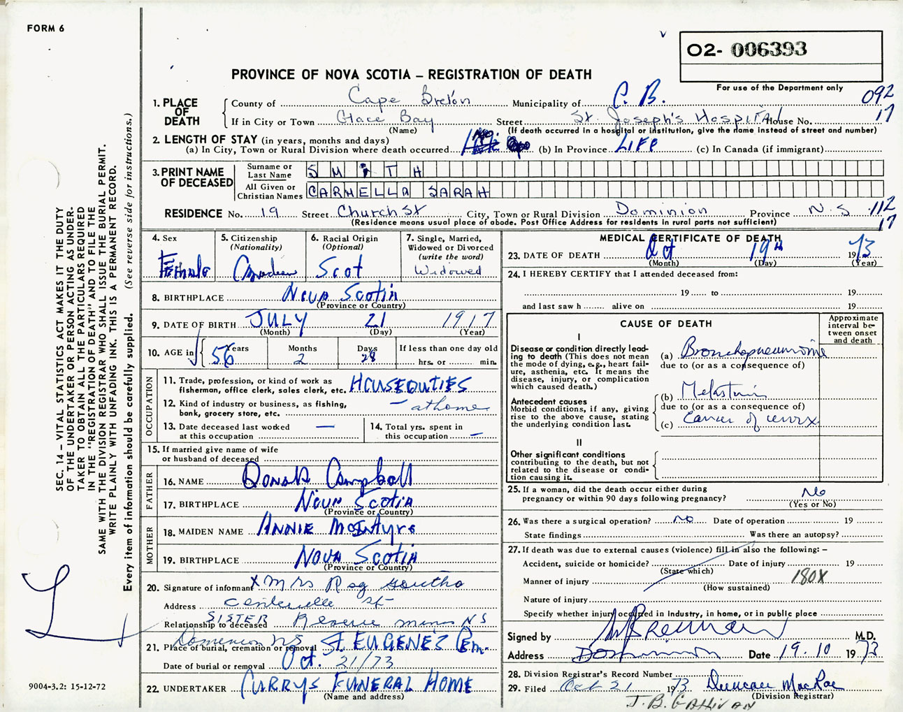 Female Death Registration: Year: 1973 number: 6393