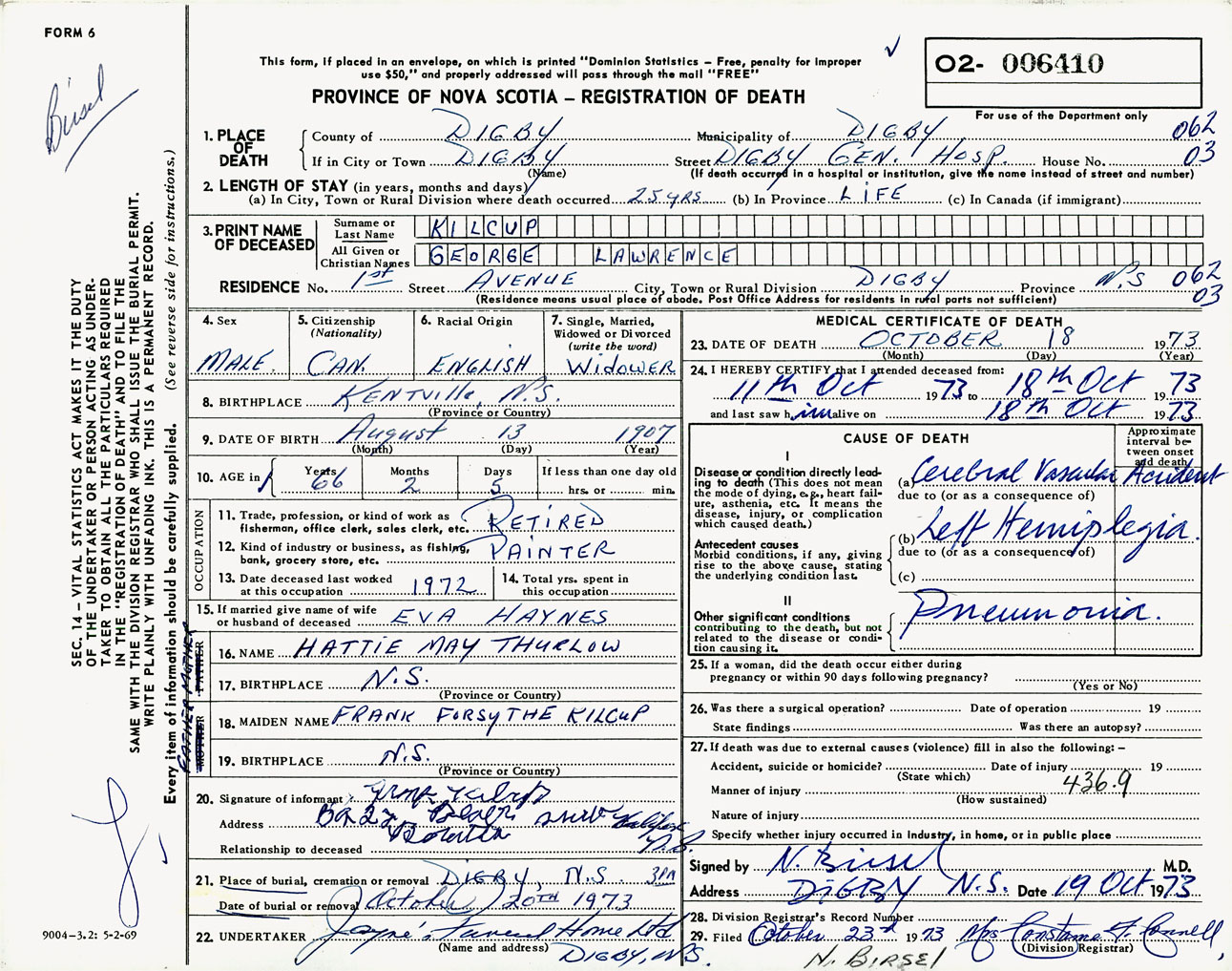 Male Death Registration: Year: 1973 number: 6410