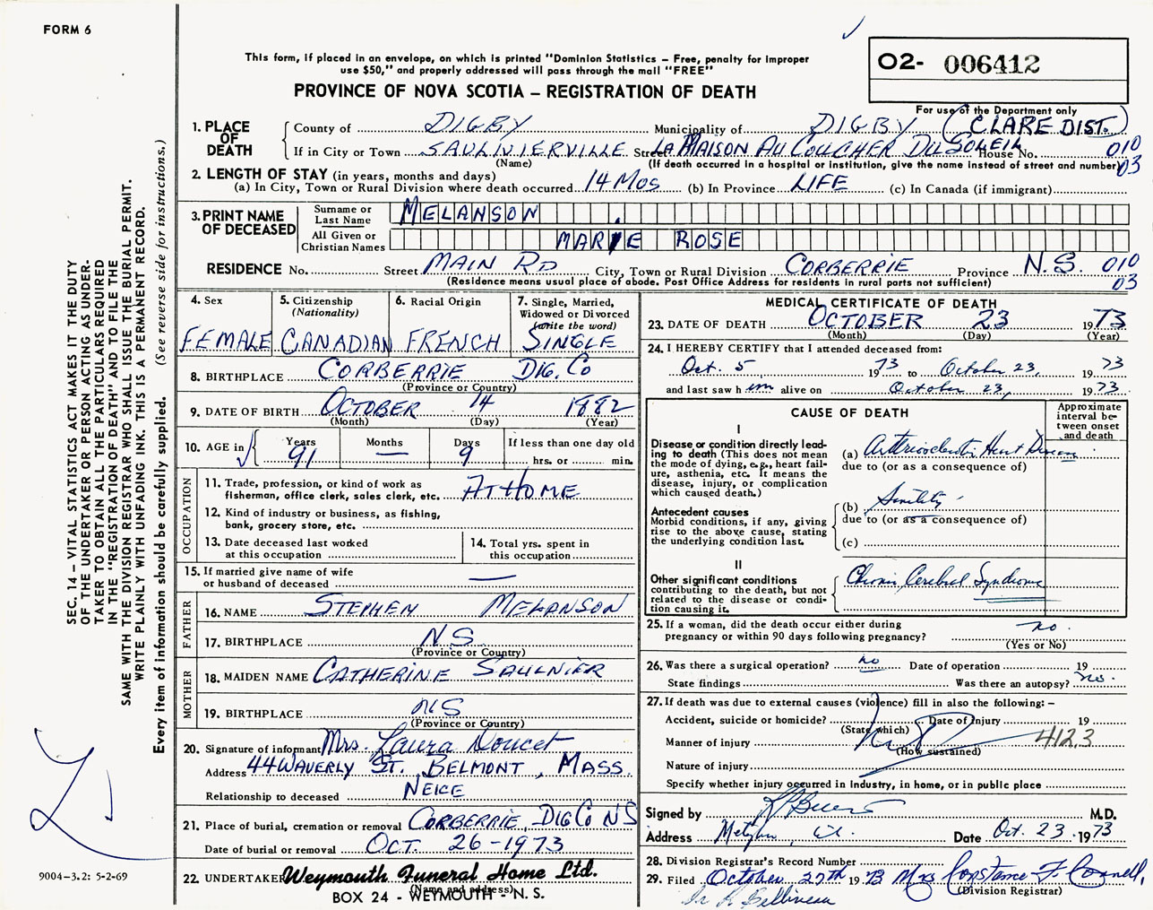 Female Death Registration: Year: 1973 number: 6412