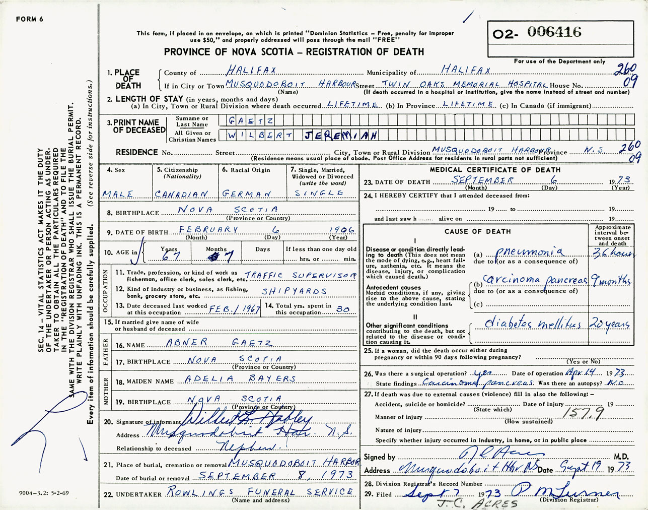 Male Death Registration: Year: 1973 number: 6416