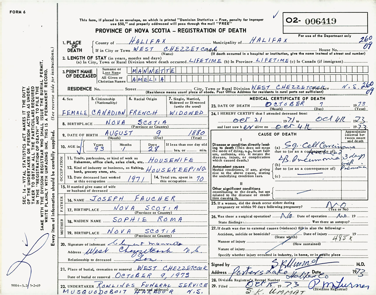 Female Death Registration: Year: 1973 number: 6419