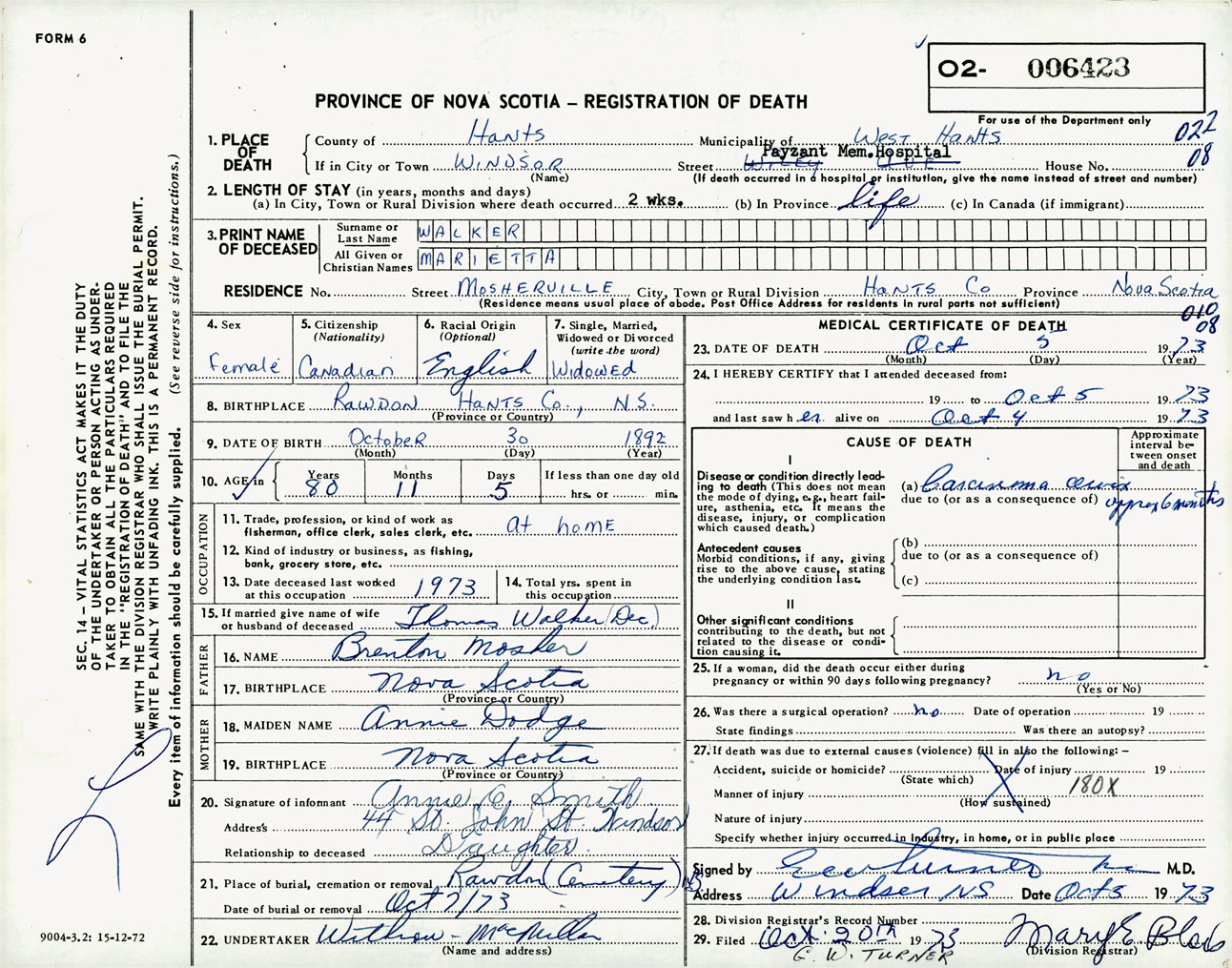 Female Death Registration: Year: 1973 number: 6423