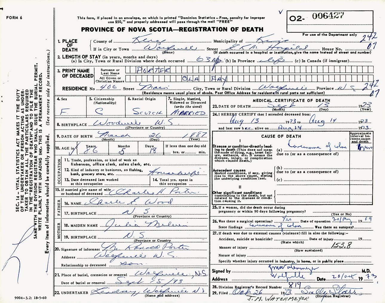 Female Death Registration: Year: 1973 number: 6427
