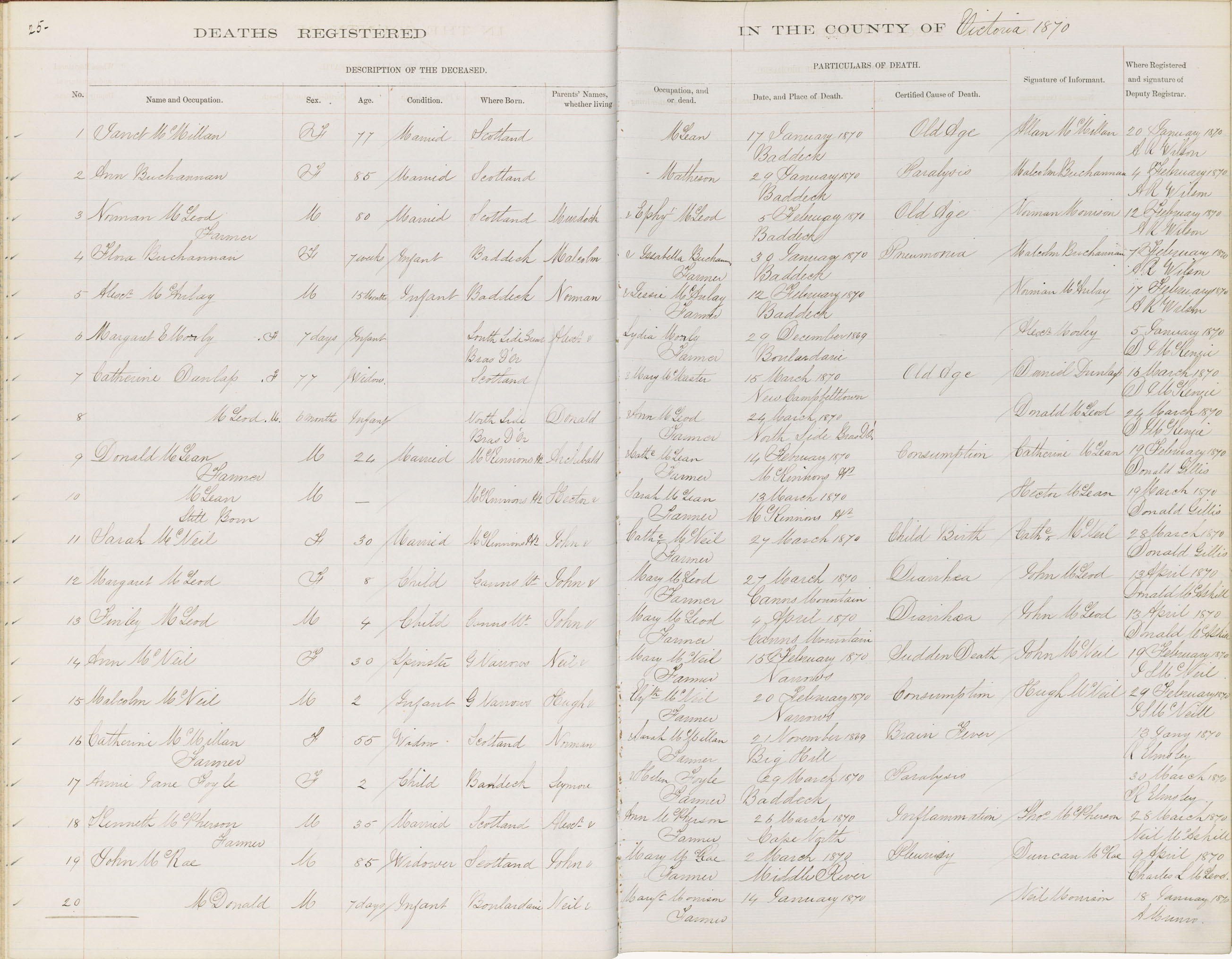 Male Death Registration: Year: 1870 book: 1817 page: 25 number: 20