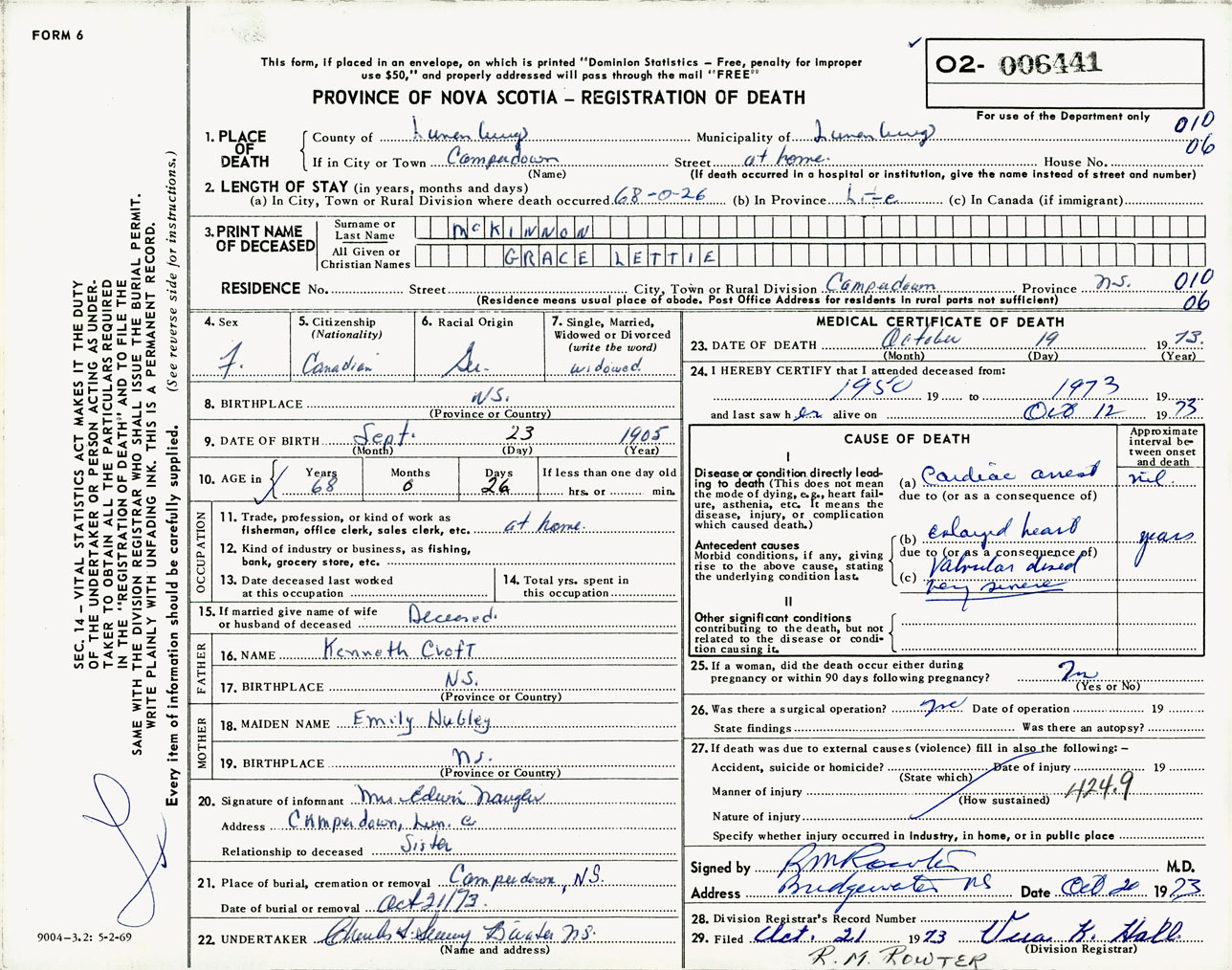 Female Death Registration: Year: 1973 number: 6441