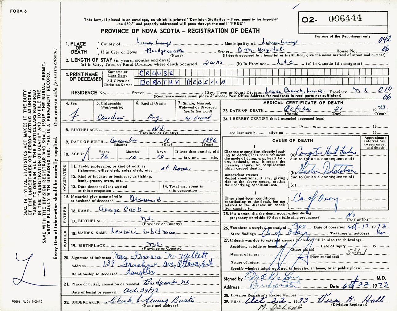 Female Death Registration: Year: 1973 number: 6444