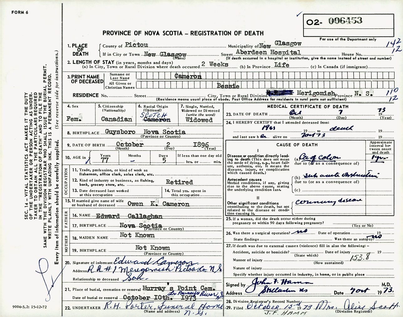 Female Death Registration: Year: 1973 number: 6453