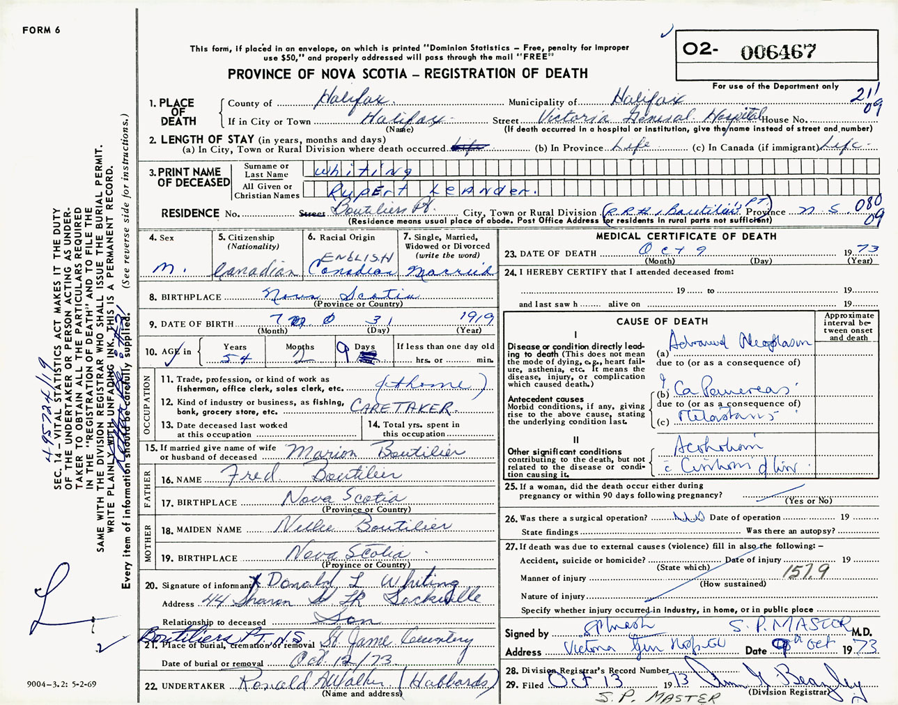 Male Death Registration: Year: 1973 number: 6467