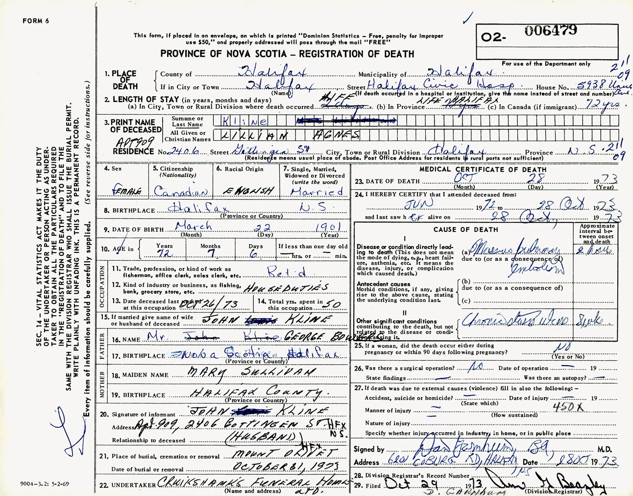 Female Death Registration: Year: 1973 number: 6479