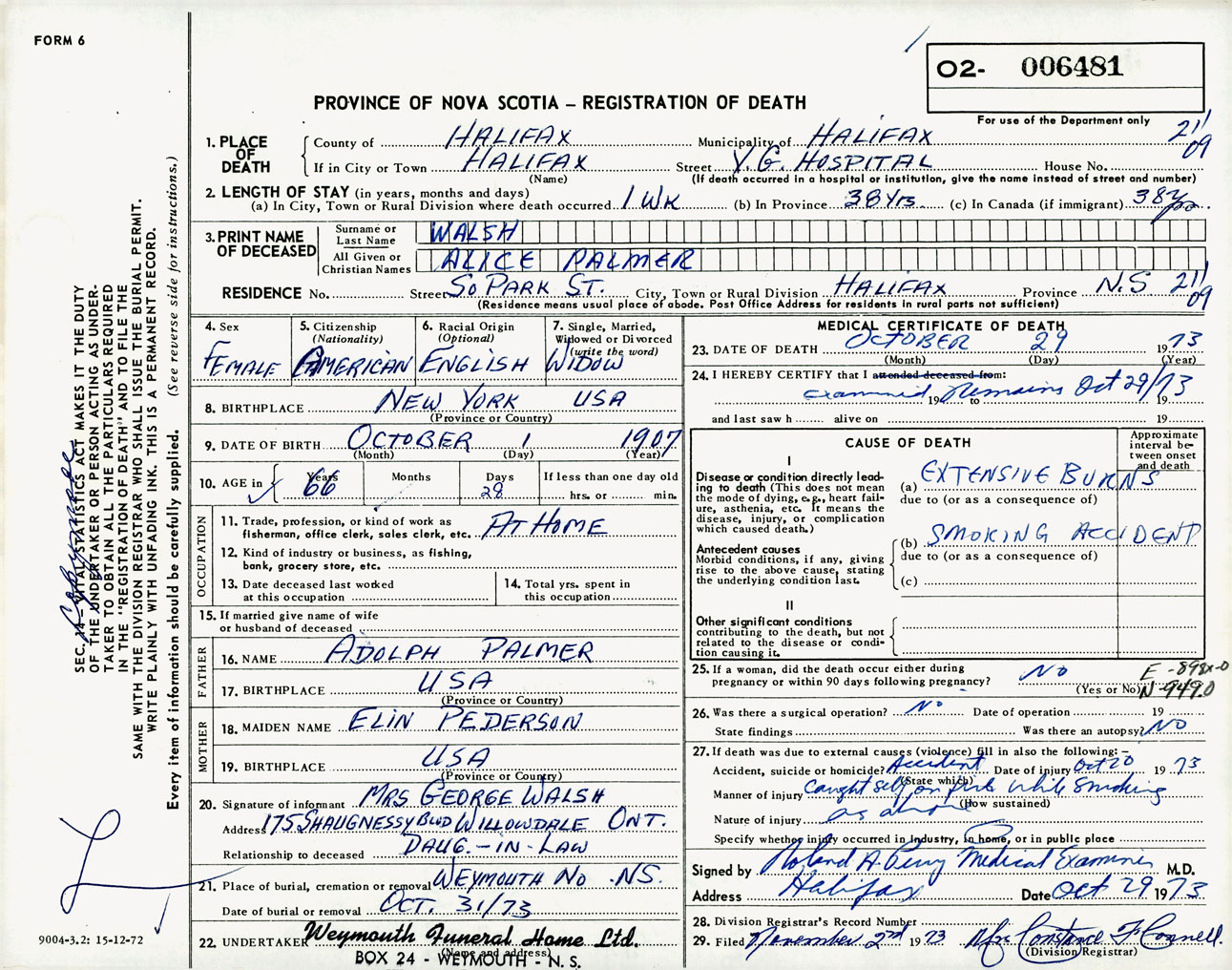 Female Death Registration: Year: 1973 number: 6481