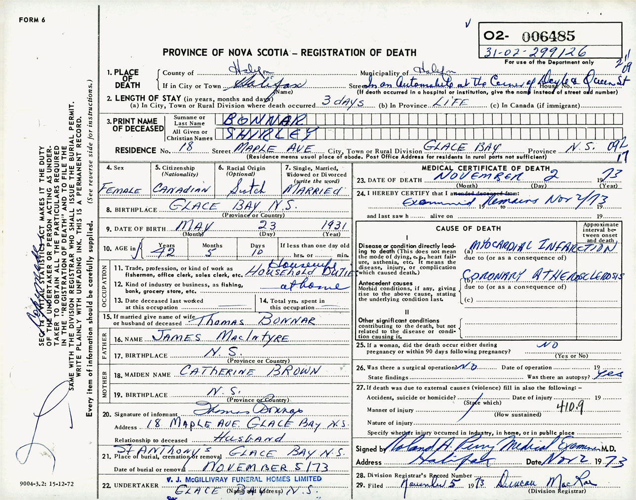 Female Death Registration: Year: 1973 number: 6485