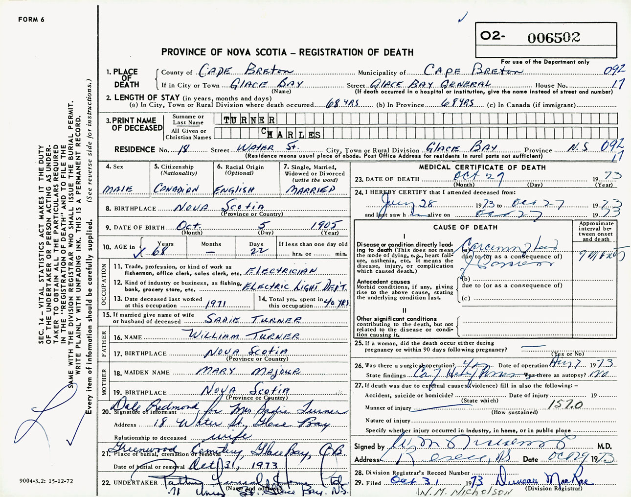 Male Death Registration: Year: 1973 number: 6502