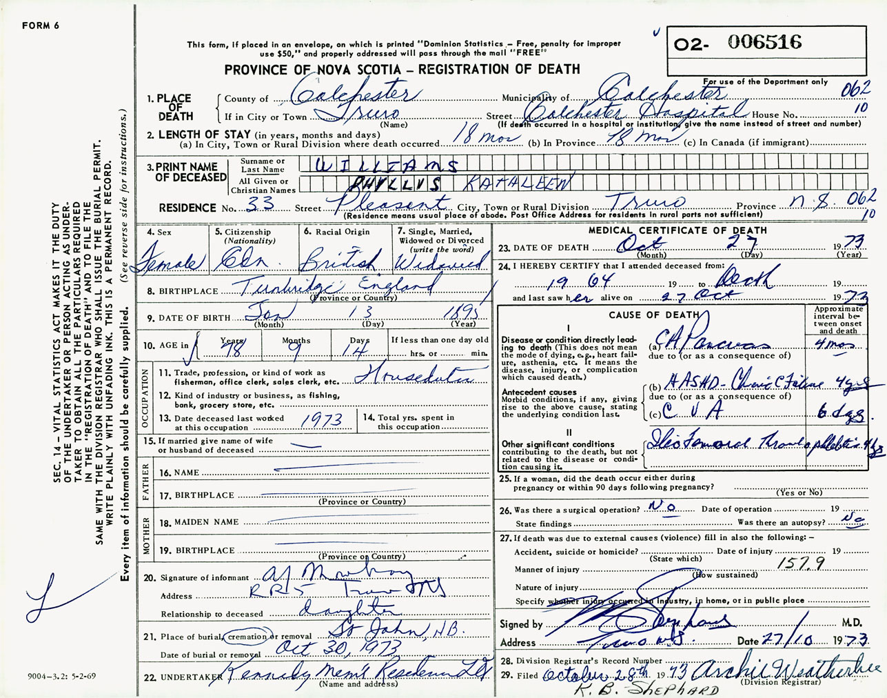 Female Death Registration: Year: 1973 number: 6516