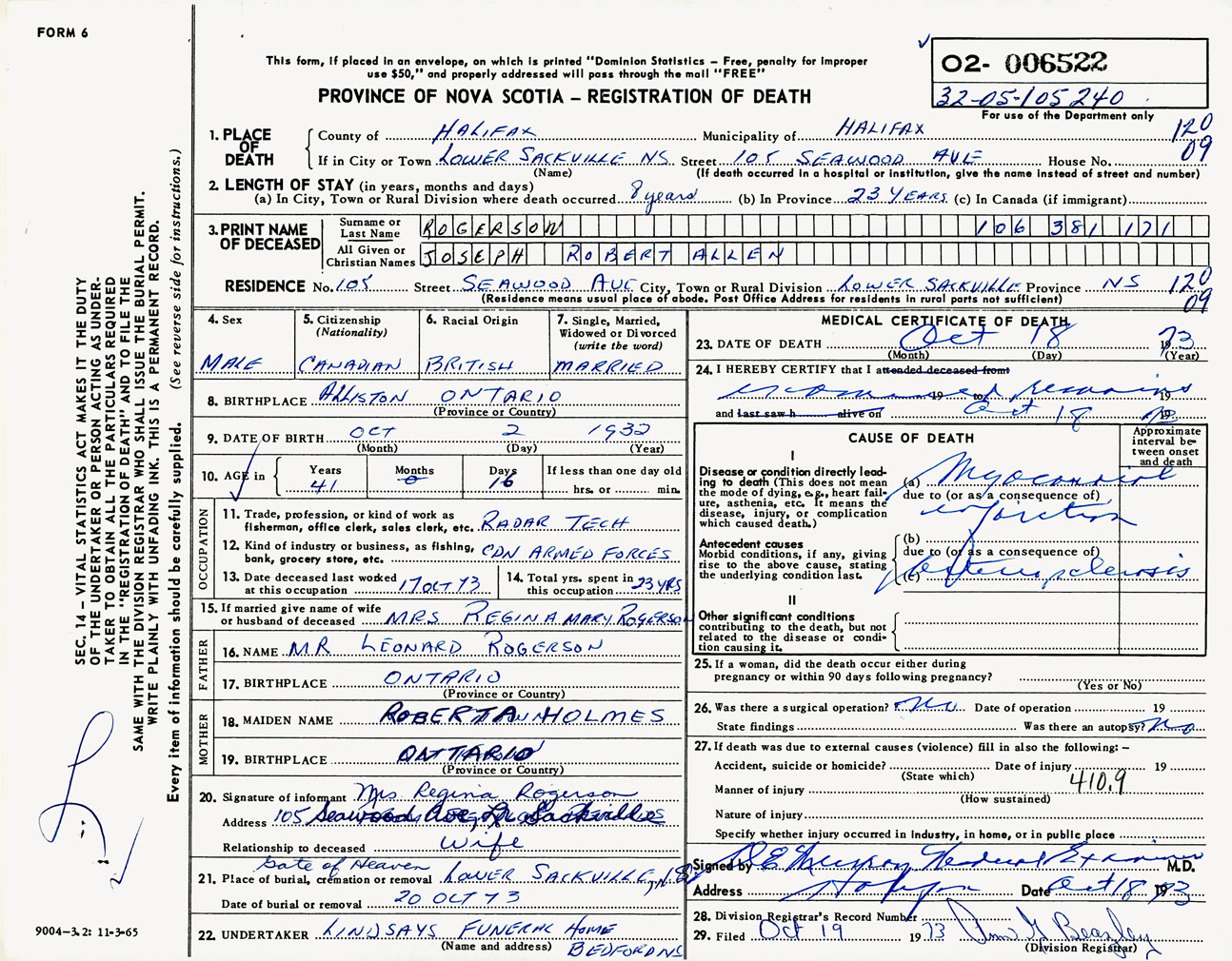 Male Death Registration: Year: 1973 number: 6522