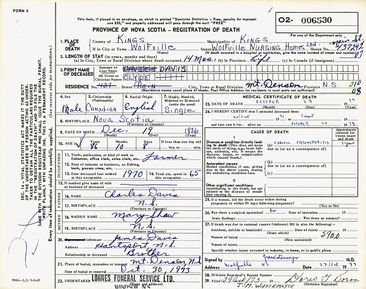 Male Death Registration: Year: 1973 number: 6530