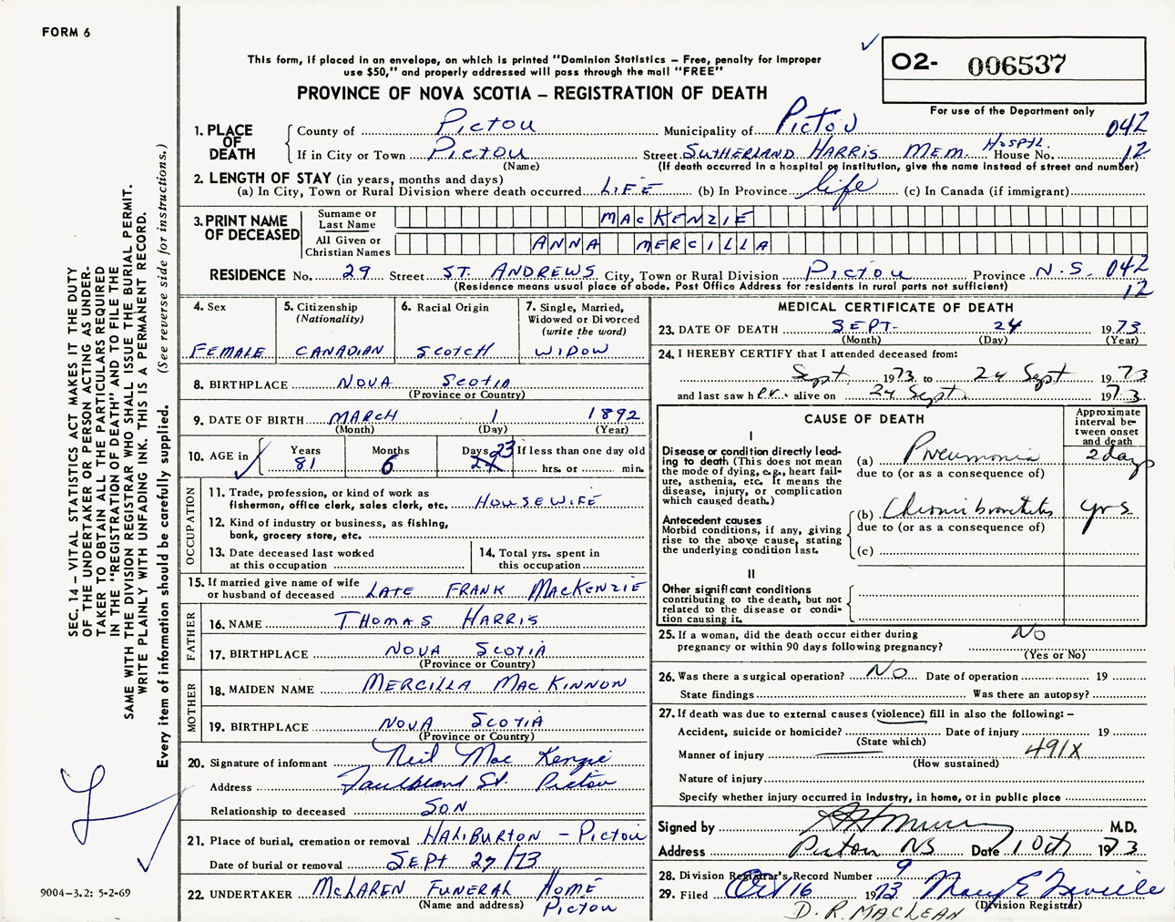 Female Death Registration: Year: 1973 number: 6537