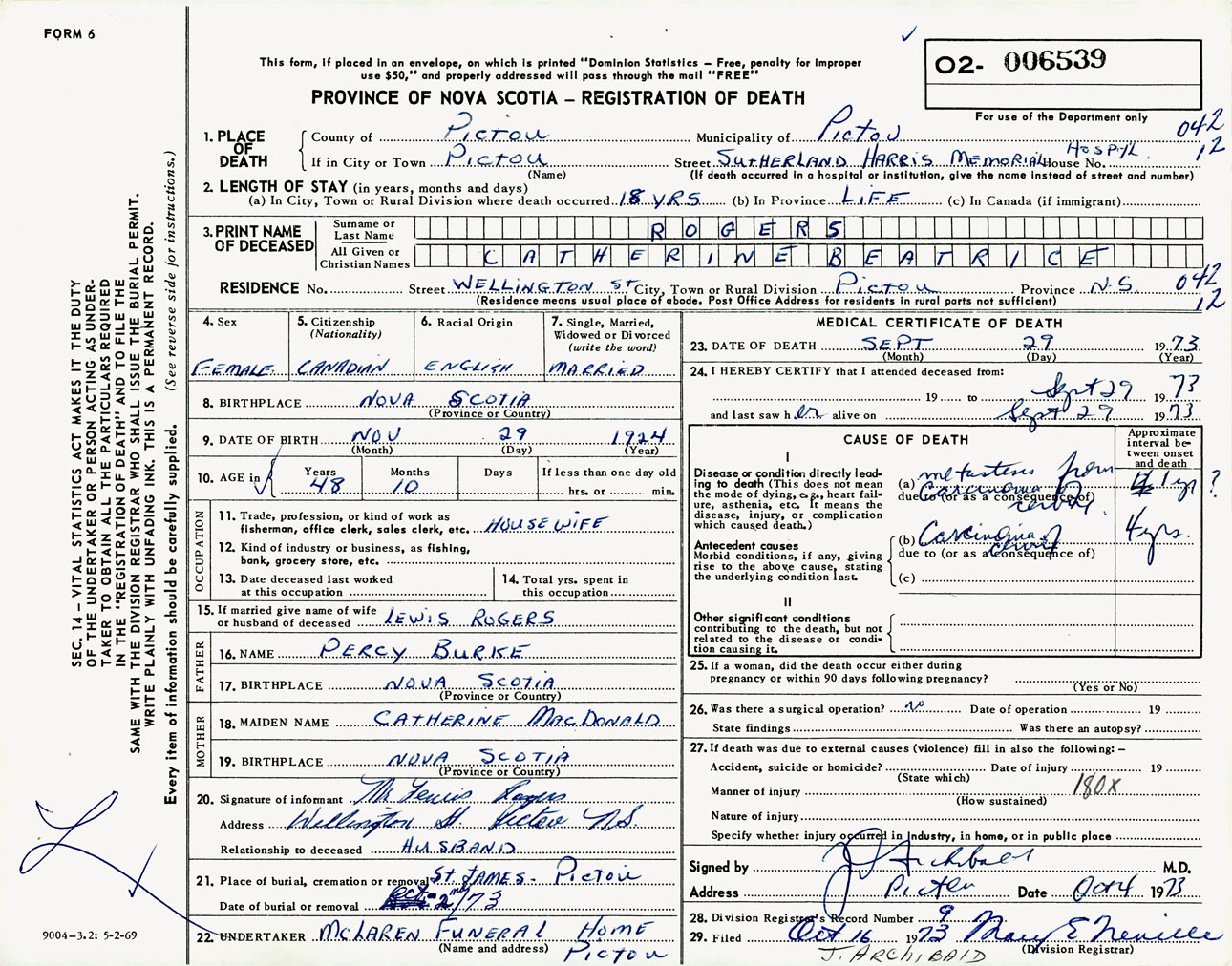 Female Death Registration: Year: 1973 number: 6539