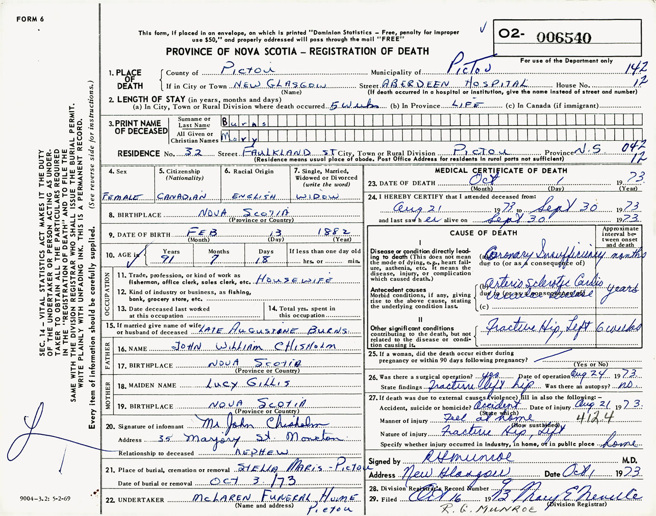 Female Death Registration: Year: 1973 number: 6540