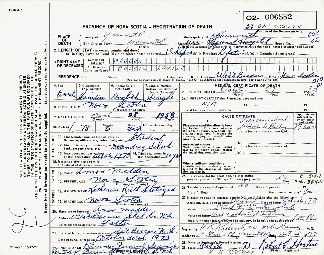 Female Death Registration: Year: 1973 number: 6552