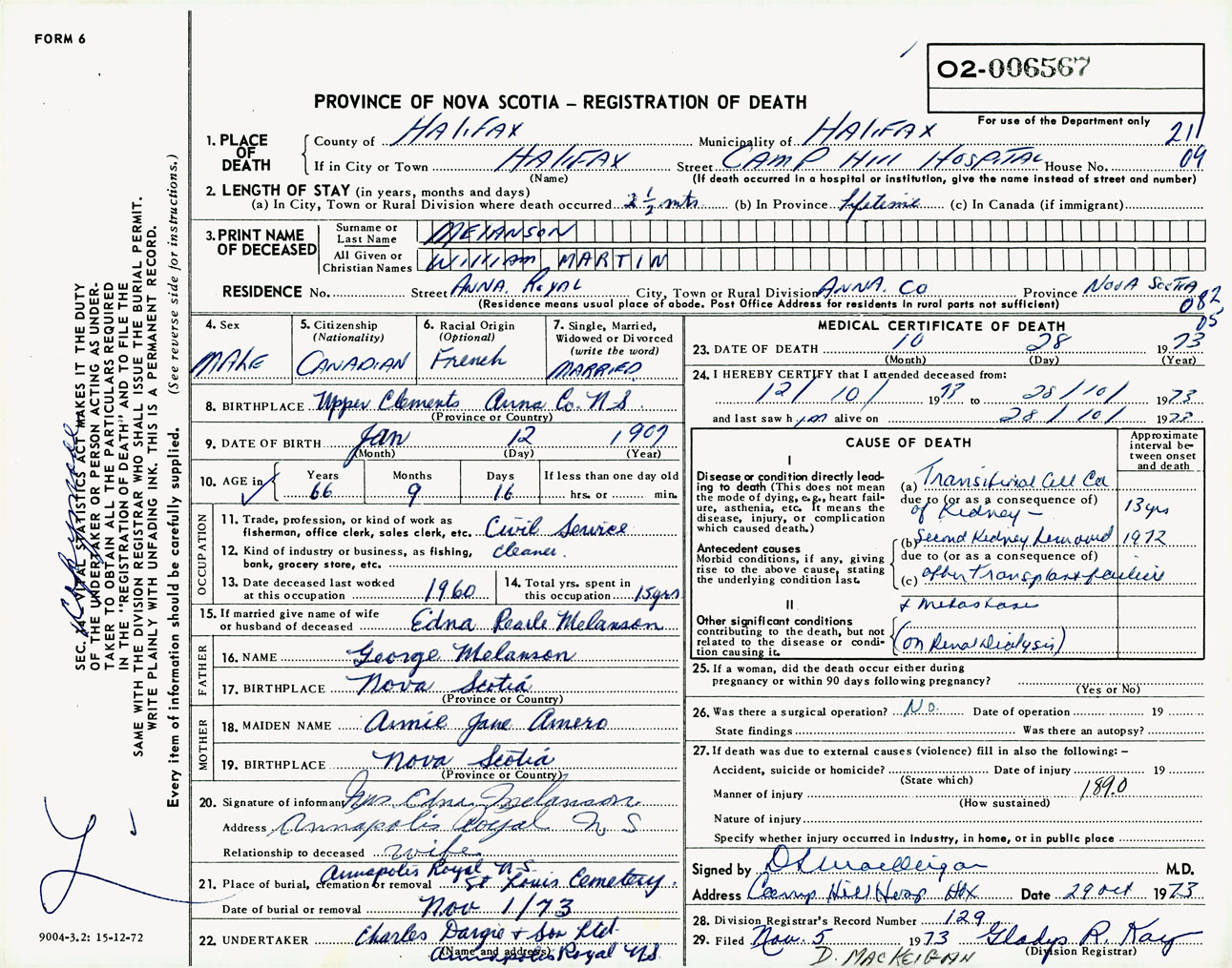 Male Death Registration: Year: 1973 number: 6567