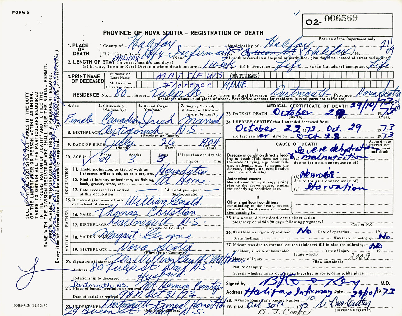 Female Death Registration: Year: 1973 number: 6569