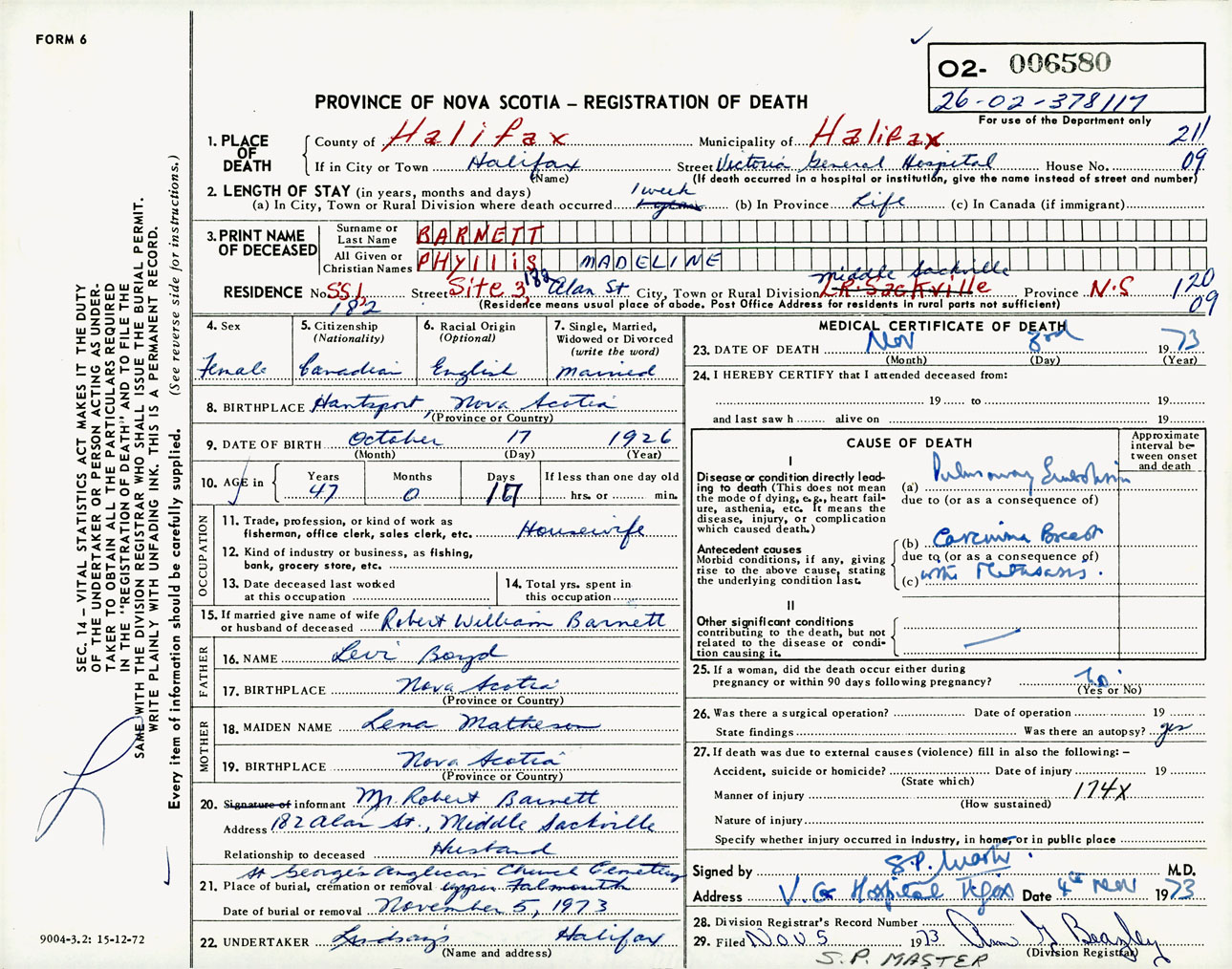 Female Death Registration: Year: 1973 number: 6580