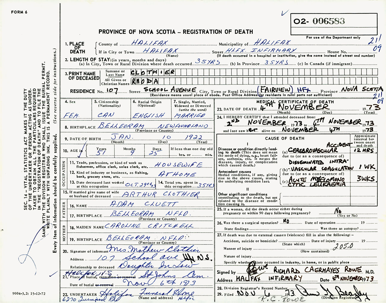 Female Death Registration: Year: 1973 number: 6583