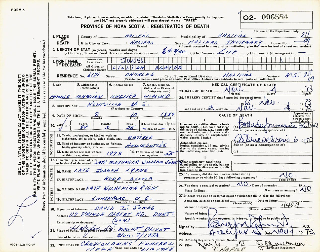Female Death Registration: Year: 1973 number: 6584