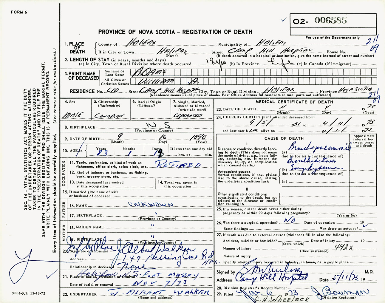 Male Death Registration: Year: 1973 number: 6585