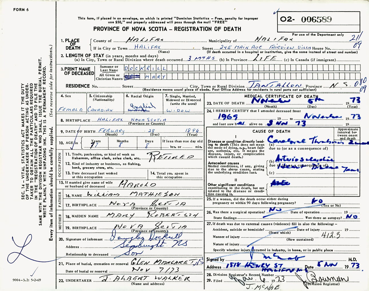 Female Death Registration: Year: 1973 number: 6589