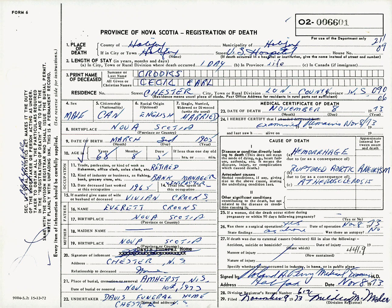 Male Death Registration: Year: 1973 number: 6601