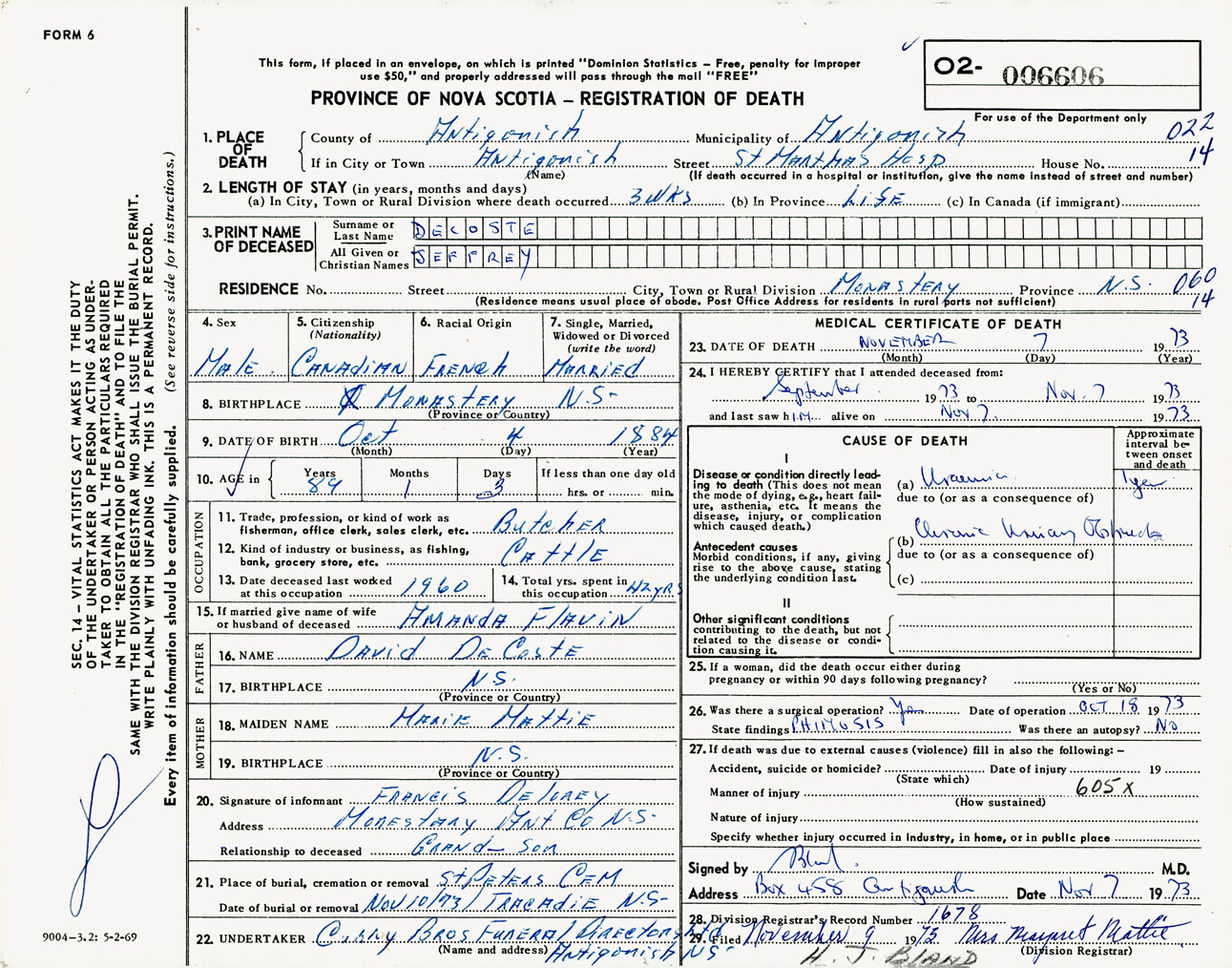 Male Death Registration: Year: 1973 number: 6606