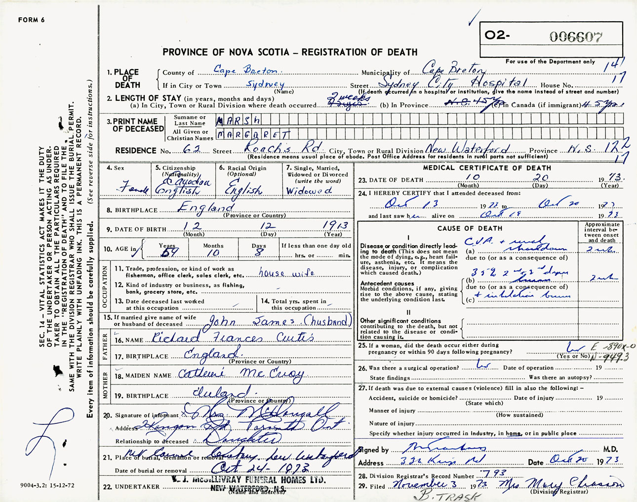 Female Death Registration: Year: 1973 number: 6607