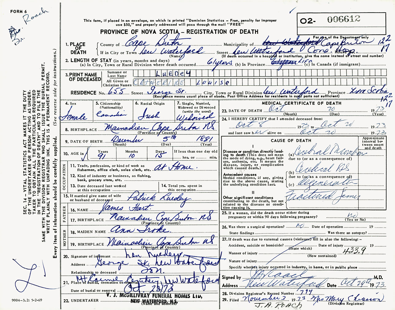 Female Death Registration: Year: 1973 number: 6612