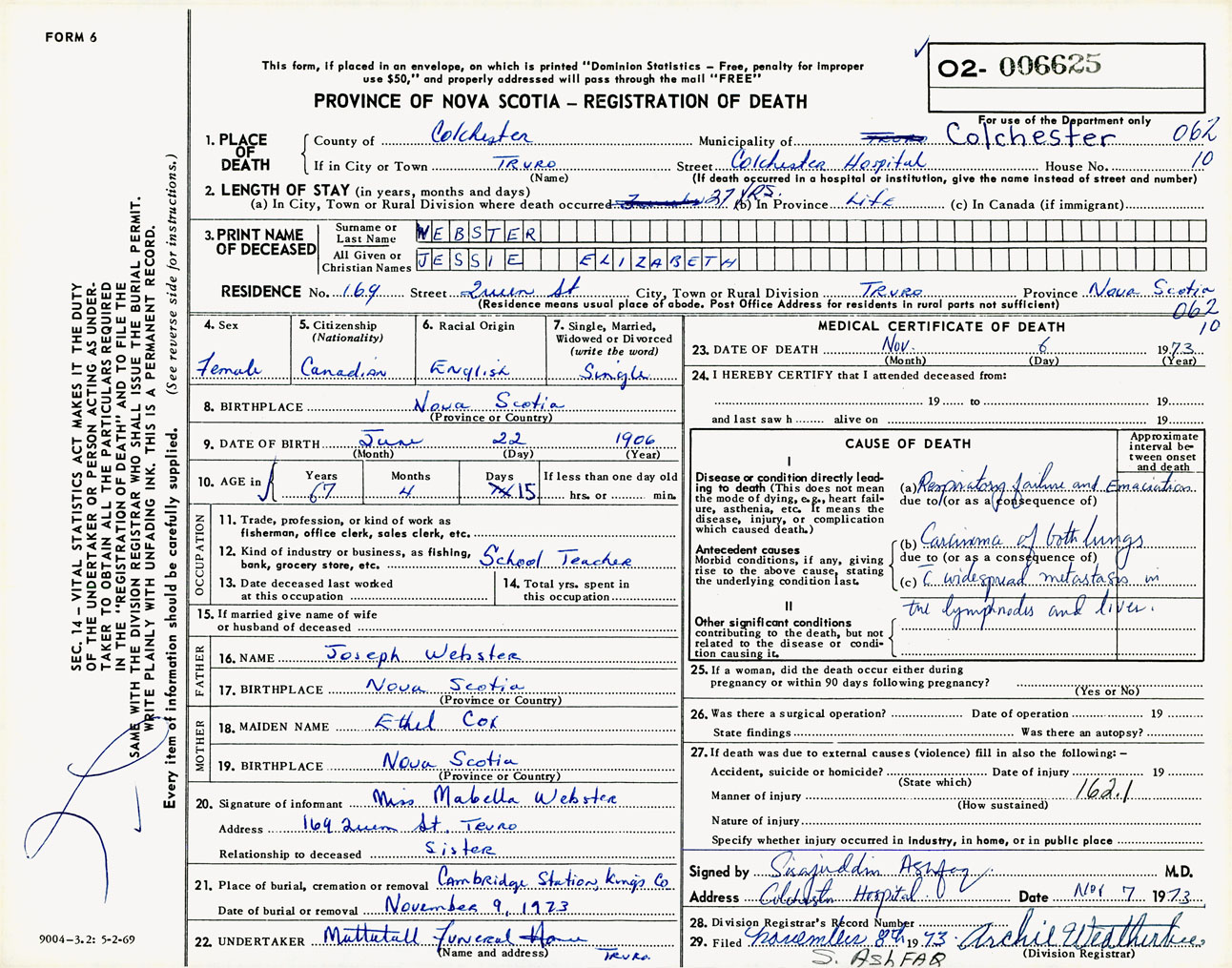 Female Death Registration: Year: 1973 number: 6625