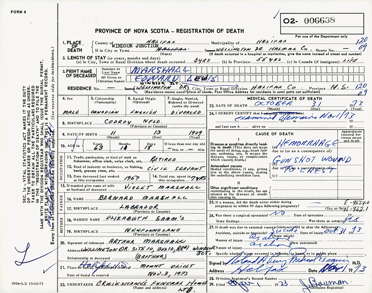 Male Death Registration: Year: 1973 number: 6638