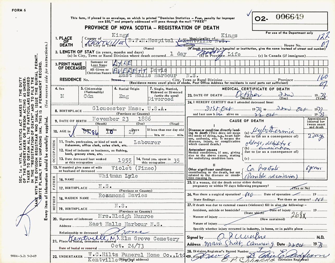 Male Death Registration: Year: 1973 number: 6649