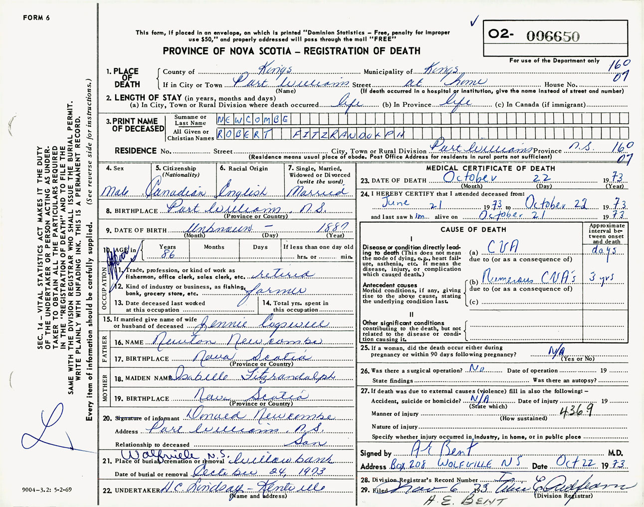 Male Death Registration: Year: 1973 number: 6650