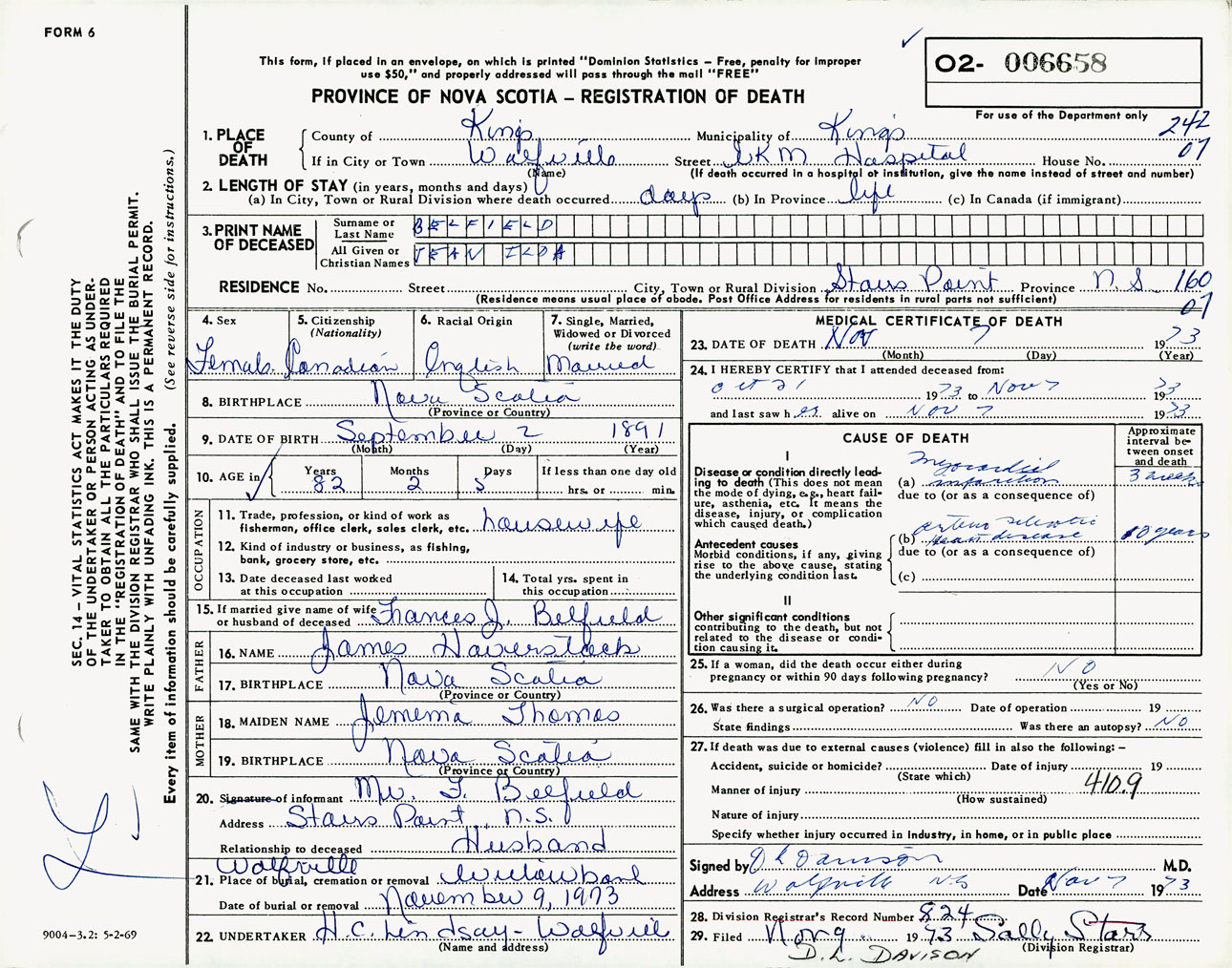 Female Death Registration: Year: 1973 number: 6658