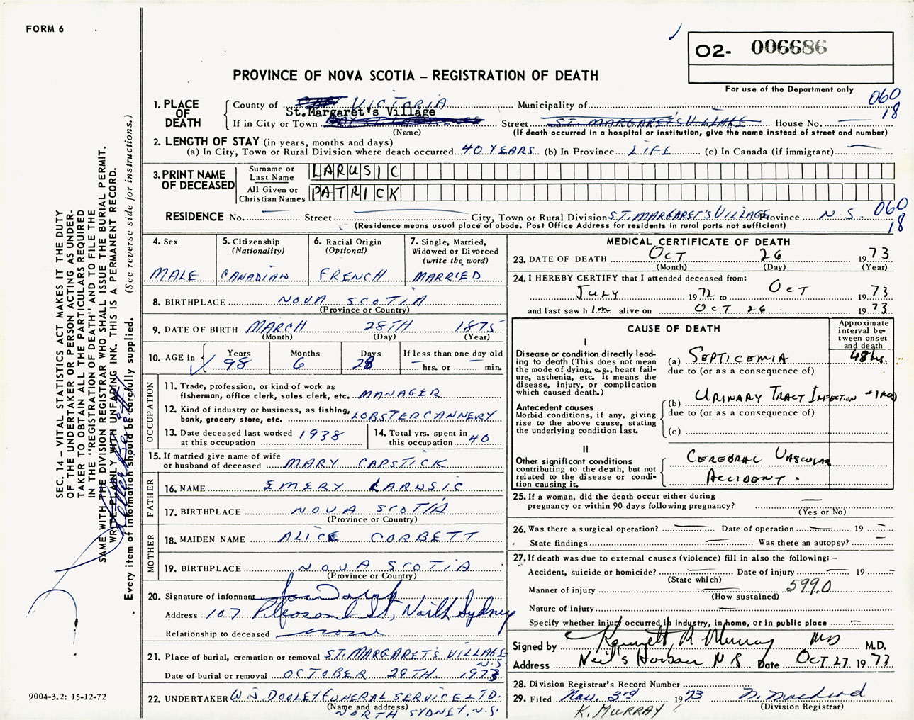 Male Death Registration: Year: 1973 number: 6686