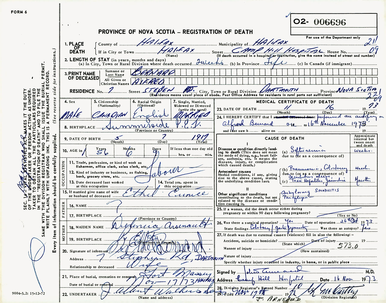 Male Death Registration: Year: 1973 number: 6696
