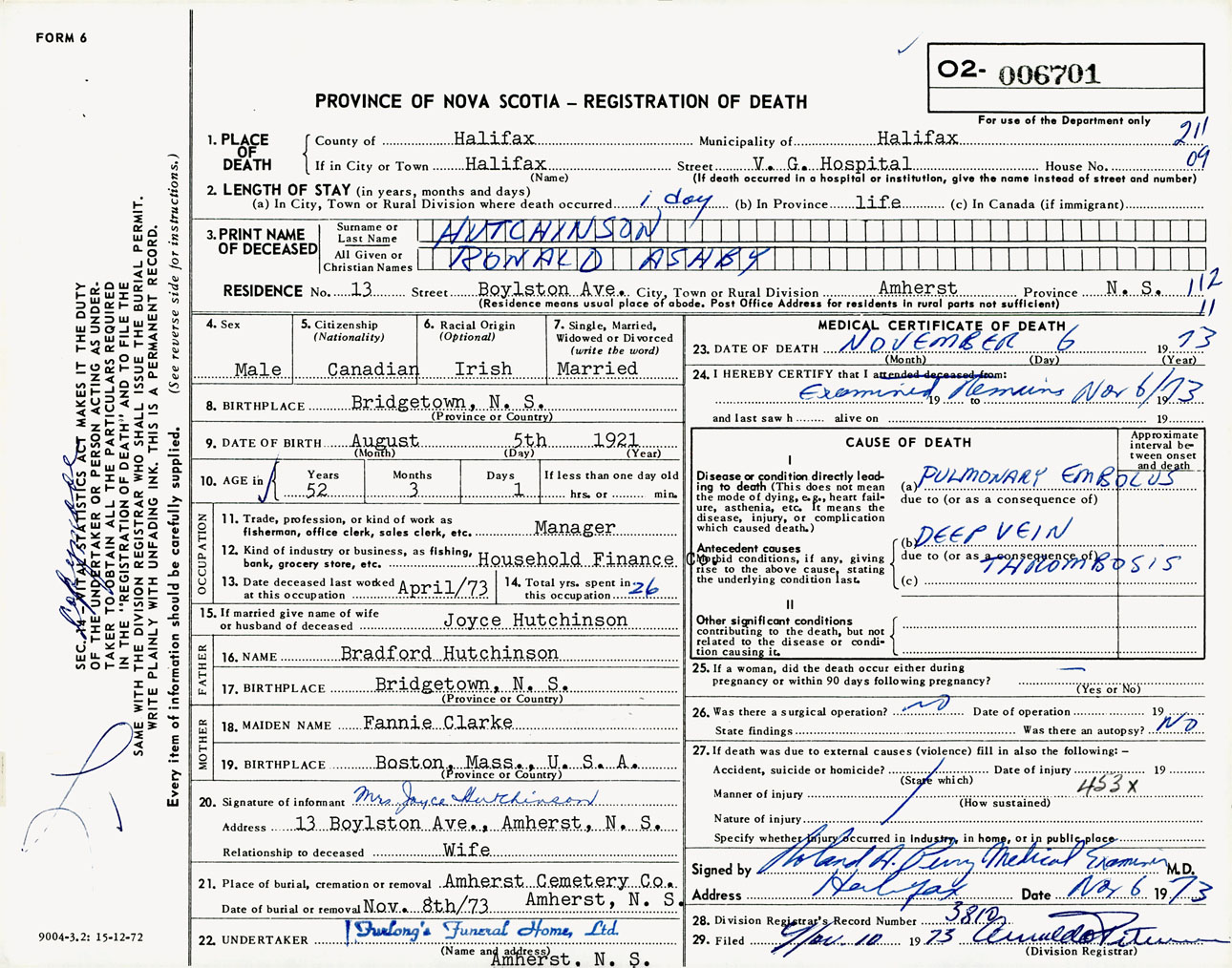 Male Death Registration: Year: 1973 number: 6701