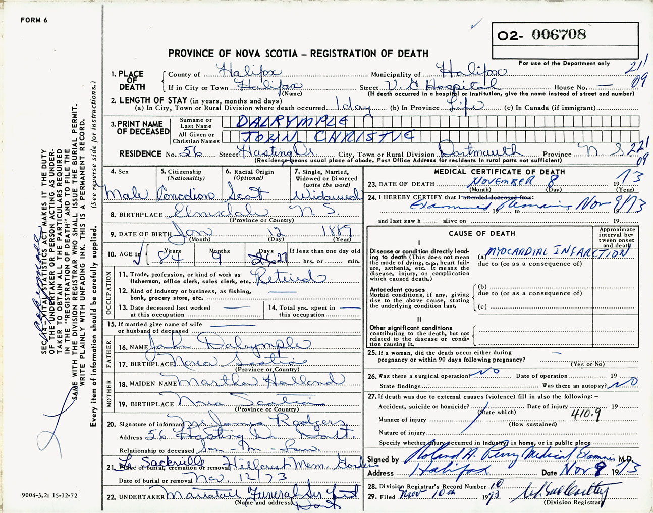 Male Death Registration: Year: 1973 number: 6708