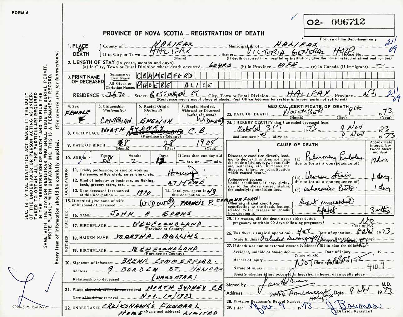 Female Death Registration: Year: 1973 number: 6712