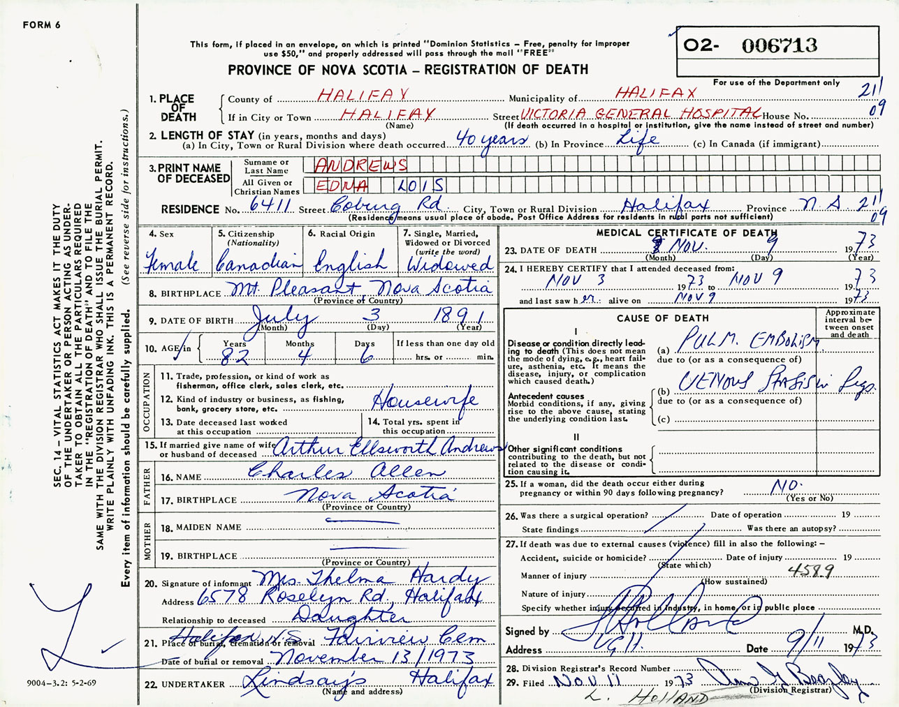 Female Death Registration: Year: 1973 number: 6713