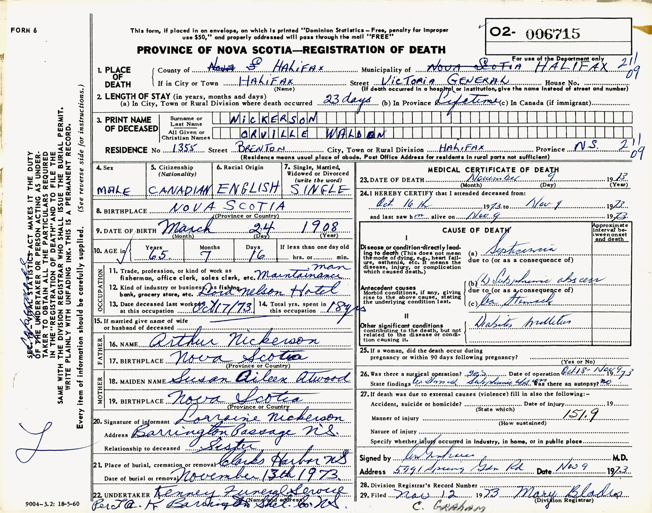 Male Death Registration: Year: 1973 number: 6715